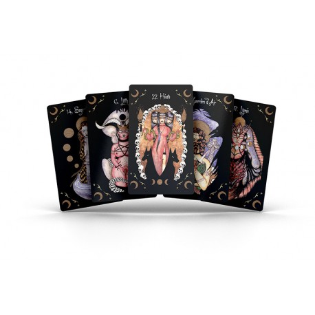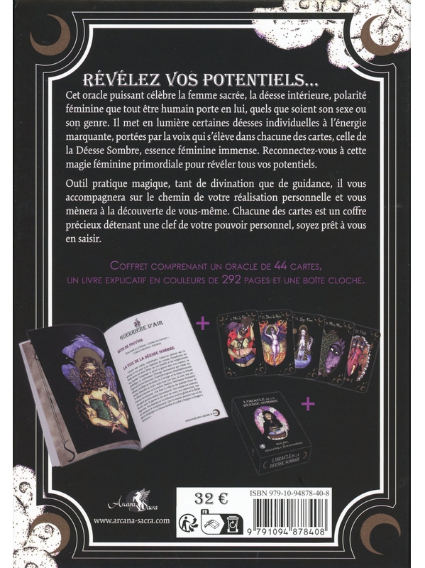 Cet Oracle atypique aux illustrations puissantes, célèbre la femme sacrée, la déesse en puissance, la polarité féminine que tout être humain porte en soi, quel que soit son sexe ou son genre. Bien plus qu’un catalogue de déesses sombres cet oracle ne se limite pas à énumérer des mythes lointains et désuets. Certes, il met en lumière certaines déesses individuelles à l’énergie marquante, cependant, la voix qui s’élève dans chaque carte est celle de LA Déesse Sombre, essence féminine immense regroupant en elle toutes les déesses et archétypes féminins sombres des différentes mythologies. Chaque carte est une porte mystique à ouvrir en vous pour vous révéler et impacter le monde. La Déesse Sombre sera votre guide et votre initiatrice. Elle vous reconnectera à votre magie féminine primordiale pour réveiller tous vos potentiels cachés et embrasser pleinement votre réalisation personnelle.