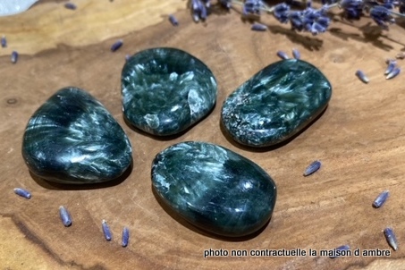 La séraphinite apaise le cœur lors d’un chagrin et nous aide à porter la douleur tant physique qu’émotionnelle. Pierre de vibration spirituelle élevée, qui nous aide à développer la compassion, la tendresse et l’amour inconditionnel. C’est une pierre de lâcher-prise, d’acceptation, elle stimule l’autoguérison. Excellente pierre pour le voyage extra corporel, la méditation, elle travaille les connexions angéliques. Connectée au chakra du coeur et au chakra coronal.